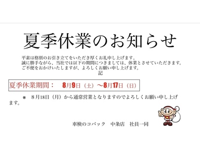 誠に勝手ながら、下記の期間を夏季休業とさせていただきます。